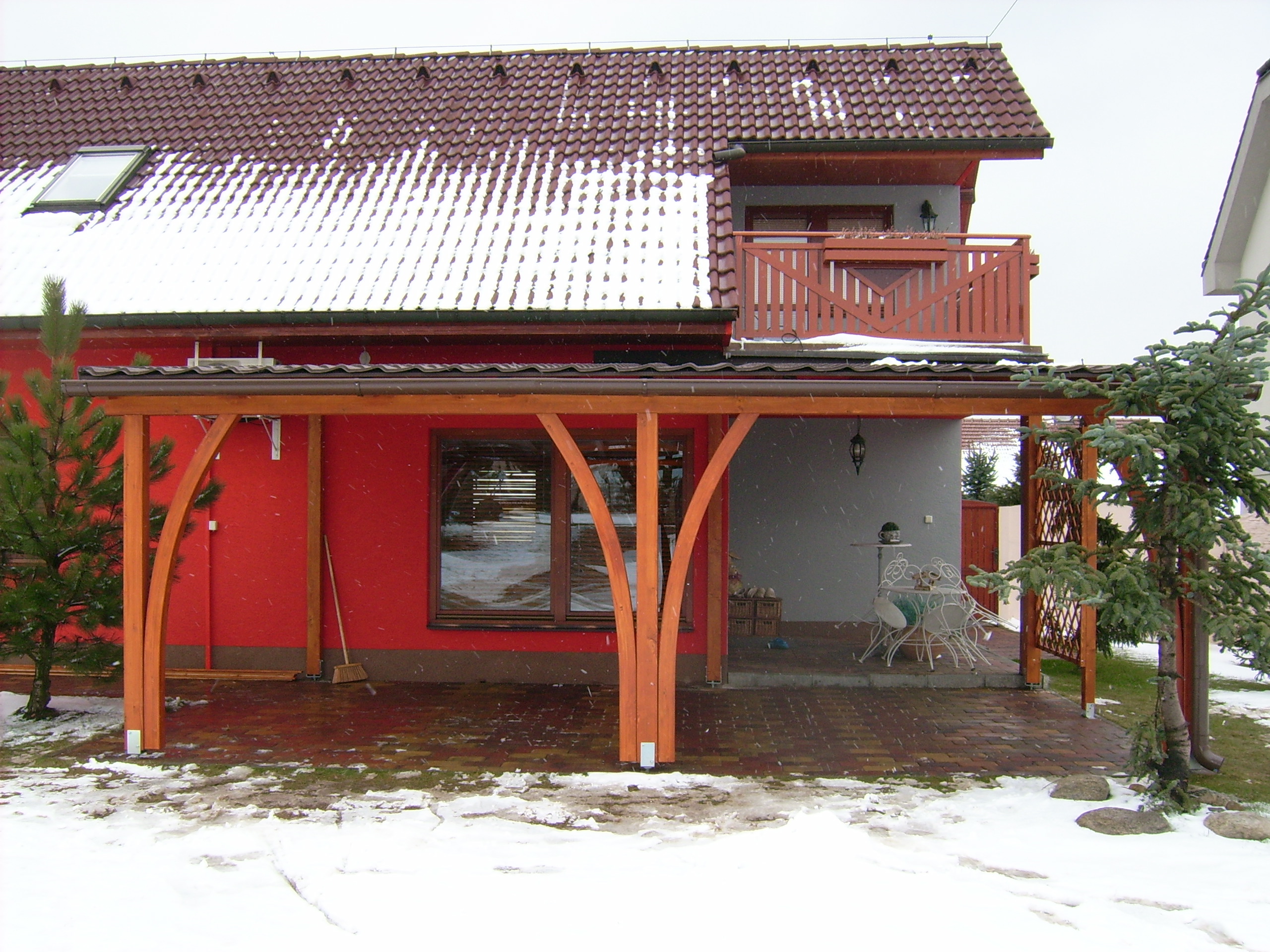 Dřevěné pergoly navazující přímo na stěnu domu bývají zhotovovány v různých provedeních. Taková pergola může být buď nekrytá - sloužící jako slunolam a nebo zastřešená, kdy se dá využívat bez omezení i za nepříznivého deštivého nebo větrného počasí.